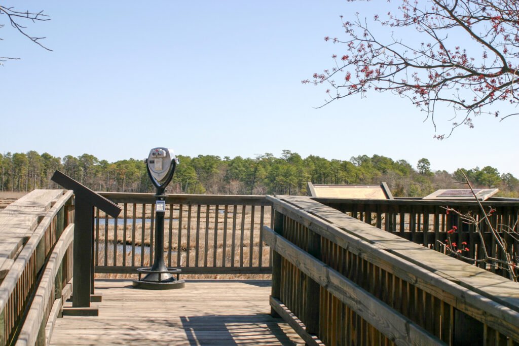 🌲 Wander through over 500 acres of pine forest, wetlands, and salt marshes. 🛤️ Seven miles of trails, including kid-friendly boardwalks and scenic pathways. 🦅 Catch sight of ospreys, butterflies, and fiddler crabs—a wildlife lover’s dream!